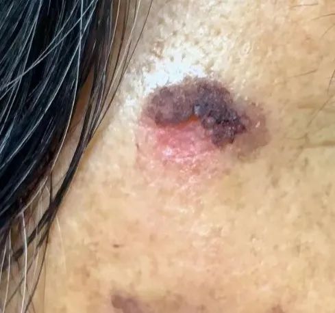 一年前,陈女士发现右侧面部多了一些褐色斑块,自认为是“老年斑”,自己使用民间偏方祛斑,部分斑确实得到改善,但是有一块始终顽固不退,反而出现红、痒、痛等不适,外涂多种药膏都没有好转。2023年3月的一天,陈女士来到柳州市工人医院皮肤科就诊。