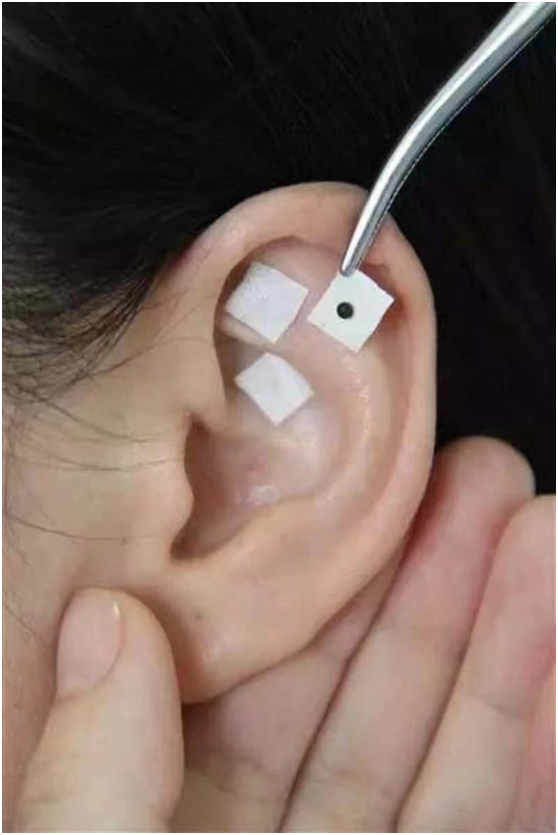将王不留行籽耳贴贴敷于耳廓上的相关穴区,并定时给予按压,也有保胎的效果。
