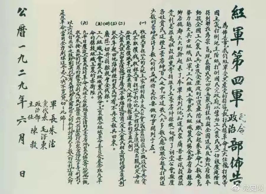 1929年6月,朱德、毛泽东、陈毅联合署名的红四军司令部、政治部布告。